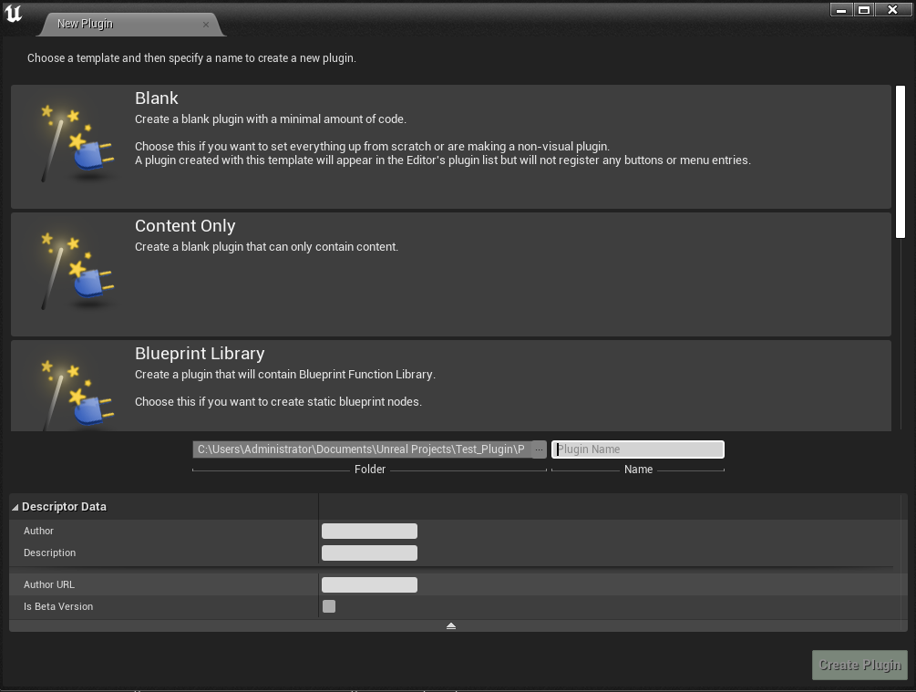UE 에디터의 뷰포트 툴바 아이콘 중 Settings > plugins > new plugin > 공백(Blank)를 선택한다. 내가 만드는 플러그인의 Name이나 Author, Description 같은 항목은 마음대로 쓰자.