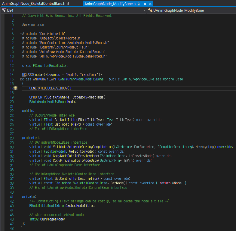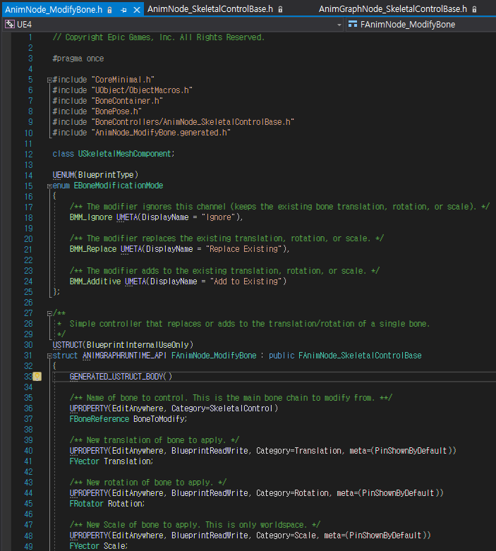 FAnimNode_ModifyBone 구조체는 FAnimNode_SkeletalControlBase를 상속하고 있다는데 당연히 FAnimNode_SkeletalControlBase는 FAnimNode_Base를 상속하고 있다.