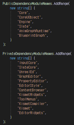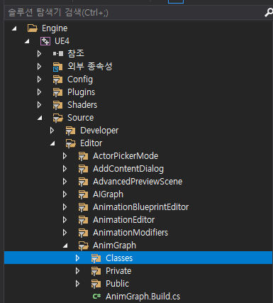 TransformModifyBone의 애님 그래프 노드를 위한 AnimGraph.Build.cs 파일을 열어보면 내 것에 추가할 모듈 BlueprintGraph, GraphEditor, PropertyEditor, EditorStyle 등이 보인다.