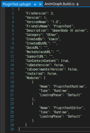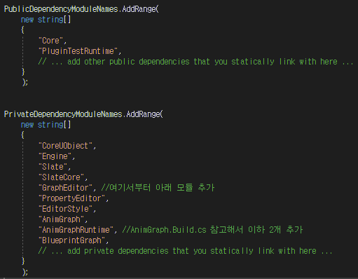 아래 이미지의 PluginTestRuntime는 PluginTestEditor가 알고 있어야 하는 애님 비헤이비어 노드 관련 모듈이라서 추가한 거다.