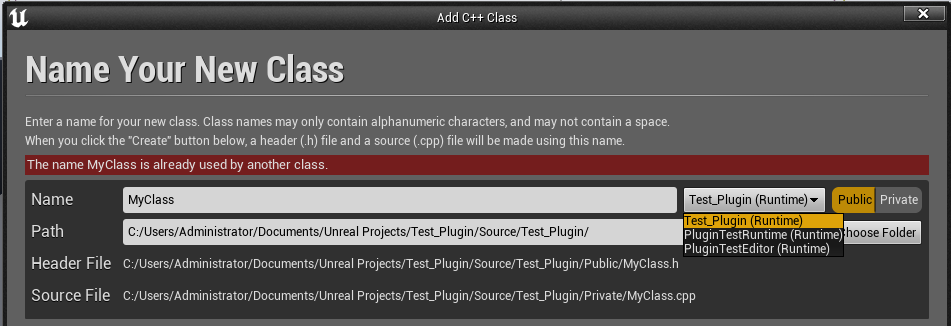 빌드 완료 후 현재 작업 중인 UE 프로젝트를 열고 새 c++ 클래스를 만들어보려 하면 아래 이미지처럼 내가 만든 PluginTestEditor, PluginTestRuntime 폴더 경로가 잘 뜬다.