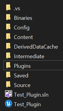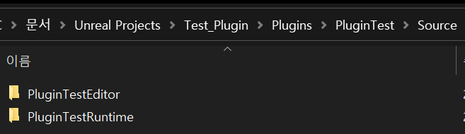 나는 플러그인 이름을 PluginTest로 지었다. 이대로 생성하면 프로젝트 폴더에 Plugins라는 폴더가 추가 생성되고 이 폴더 안에 내가 PluginTest 폴더가 들어가 있다.